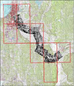 River To Find and Download Orthophotos: Select an orthophoto tile on the reference image (right). A close-up image will appear in a viewer window to the right, with links to download a full-sized, high-resolution version of the image. This set includes air photos covering the Snohomish River. Data is organized and named by quarter quad (red grid at right) and is zipped into a UTM ZONE 10N NAD27 and a UTM ZONE 10N NAD83/HARN .zip file that includes a geo-tiff (.tif) and metadata (.html). The reference image (right) shows the photo mosaics draped over contemporary topo maps and shaded relief. A hi-res poster of this reference image (right) may be downloaded in .pdf format for educational and personal use.